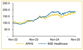 Apollo HealthCo delivered INR 26,606Mn in revenue, up 17% YoY, with EBITDA margin improving to 10% to 11%. The digital platform (Apollo 24/7) crossed 44 million users, driving a GMV of INR 7,230Mn (+16% YoY). APHS is integrating its online (24/7), offline pharmacy and diagnostics networks, targeting breakeven by FY26-end. Growth will be driven by 25–30% annual GMV expansion through pharmacy scale-up, insurance offering and diagnostics. Margin gains will come from cost discipline, private-label growth and digital reach in over 7,000 stores.