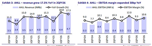 * Healthcare services’ revenue grew 9% YoY to INR31.7b, driven by growth in both inpatient volume (+2%) and the price and case mix (+7%). Healthco’s revenue grew 17% YoY to INR26.6b. AHLL’s revenue grew 17% YoY to INR4.7b, primarily driven by growth in diagnostics.