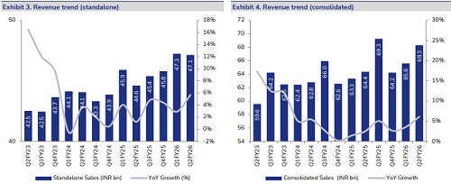 * 2QFY26 – Margin above estimate: APTY reported standalone revenue of INR 47.1bn (+5.7% YoY, flat QoQ). EBITDA for the quarter stood at INR 7.2bn (+33.7% YoY, +11.8% QoQ), with an EBITDA margin of 15.3% (+320bps YoY, +160bps QoQ). At the consolidated level, APTY reported revenue of INR 68.3bn (+6.1% YoY, +4.1% QoQ), 4% above JMFe. Cons. EBITDA came in at INR 10.2bn (+16.3% YoY, +17.6% QoQ), 15.5% above JMFe. Cons. EBITDA margin stood at 14.9% (+130bps YoY, +170bps QoQ), 150bps above JMFe due to lower-than-expected RM costs. Adjusted consolidated PAT stood at INR 4.4bn (+44.8% YoY, +14.4% QoQ), 27.9% above JMFe. However, reported PAT came in at ~INR 2.6bn (-13.2% YoY), impacted by restructuring costs at Apollo Netherlands (~INR 1.8bn) and an employee restructuring exercise (INR 36mn).