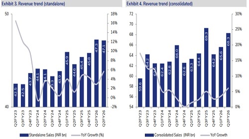 * 2QFY26 – Margin above estimate: APTY reported standalone revenue of INR 47.1bn (+5.7% YoY, flat QoQ). EBITDA for the quarter stood at INR 7.2bn (+33.7% YoY, +11.8% QoQ), with an EBITDA margin of 15.3% (+320bps YoY, +160bps QoQ). At the consolidated level, APTY reported revenue of INR 68.3bn (+6.1% YoY, +4.1% QoQ), 4% above JMFe. Cons. EBITDA came in at INR 10.2bn (+16.3% YoY, +17.6% QoQ), 15.5% above JMFe. Cons. EBITDA margin stood at 14.9% (+130bps YoY, +170bps QoQ), 150bps above JMFe due to lower-than-expected RM costs. Adjusted consolidated PAT stood at INR 4.4bn (+44.8% YoY, +14.4% QoQ), 27.9% above JMFe. However, reported PAT came in at ~INR 2.6bn (-13.2% YoY), impacted by restructuring costs at Apollo Netherlands (~INR 1.8bn) and an employee restructuring exercise (INR 36mn