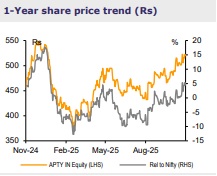 Apollo Tyres (APTY) posted modest revenue growth (up 6% YoY) to Rs68.3bn, aided by growth across APMEA/EU (+5.5/+13.5% YoY). However, EBITDA grew stronger, by 16% YoY to Rs10.2bn led by dual benefit of gross-margin expansion (up by 170bps QoQ) and operating leverage. The mgmt remains optimistic on a healthy H2, led by GST-driven demand uplift (Oct has also seen uptick in demand) and favorable macros/revival in infra spends. Margin is expected to rise further in Q3, on stable RM prices (with some downward bias) and closure of Enschede plant (by Jun-26), unlocking structural cost benefits. We raise FY26E/27E/28E EPS by 6% each, led by improving profitability, operating efficiencies, and phased flow-through of European restructuring benefits. We maintain BUY on APTY, given healthy H2 outlook across India/EU, and mix-led (better TBR vs PCR pickup) and restructuring-led margin tailwinds in EU. We raise our TP by ~14% to Rs600 (from Rs525), basis 17x Sep-27E PER.