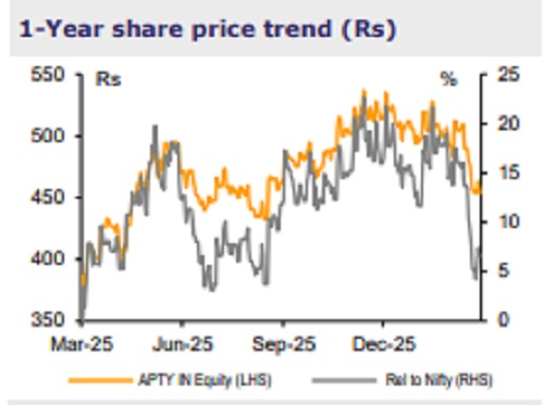 We met the management of APTY. KTAs: 1) Demand is strong, with double-digit YoY growth across channels and segments in Q4, triggered by recent GST cuts; outlook for FY27 also appears healthy. 2) RM prices are expected to be flattish QoQ in Q4FY26, with ~3% rise expected in Q1FY27. 3) Tight demand–supply dynamics should support tyre makers’ pricing power; APTY has already taken certain price hikes in Jan-26 (0.6%/1.5% in PCR/LTR); similar actions are also visible across peers. 4) The management continues to target 14-15% margin for its standalone business despite rising RM costs, supported by calibrated price hikes, lower discounting, and an improved product mix; Q4 margin might witness compression due to sponsorship-related spends being concentrated in Q3/Q4; it reiterated its 15% long-term RoCE target. 5) Over the past few quarters, the tyre industry has refrained from price cuts despite softer RM, reflecting improved pricing discipline and sharper profitability focus (refer to: Tyre demand-supply tightening; focus on margin sharpens). 6) While APTY has announced capacity addition (Rs58bn), the capacities would come onstream only by end-FY28/FY29 (on normal 2-3-year gestation period); FY27 demand would be supported via 4k PCR tyres/day each in India and Hungary and supplemented by outsourcing. 7) Capacity expansion in EU will be limited, with increased exports from India. 8) The Netherlands plant closure and shift of manufacturing from Hungary to India will reduce conversion cost, raise margin (200-300bps in FY28; near-term pressure in H1FY27 due to transition, with stabilization from H2FY27). We build in 8%/14/24% revenue/EBITDA/EPS CAGR over FY26-28E; retain BUY with TP of Rs600, at 17x Dec-27E PER