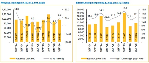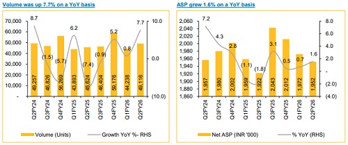 * Revenue was up 9.3% YoY to INR 95,882 Mn (vs CIE est. at INR 97,834 Mn), led by 7.7% YoY growth in volume and 1.6% YoY growth in ASP.