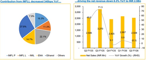 * Net revenue for Q2FY26 was at INR 2.5Bn, down 0.3 YoY and 4.8% QoQ (vs CIE est. at INR 2.7Bn).