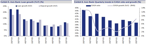 * Loan/deposit growth better than expectation; rise in LCR outflow rate weigh CASA: Bank reported loan/deposit YoY growth of ~12%/11% better than sector growth and JMFe. Improvement in loan growth was mainly driven by pick up in corporate/SME lending (20%/19% YoY). However the overall momentum was partially offset by subdued growth in retail (~6% YoY). Within retail, HL/Auto loan growth declined by ~1%/2% YoY, while unsecured retail credit (PL+CC) growth remain sluggish at 5% YoY. CASA ratio continue to remain flat despite traction in CA (grew 13% YoY) due to increase LCR outflow rate to 27.2% from 25.5% in Mar’25.