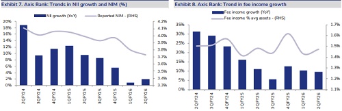 * Valuation and view: Axis bank delivered operating profit beat despite lower treasury gains and increase in opex. Bank has delivered a surprise on margin front with just 7bps contraction. We expect loan growth momentum to inch-up ~15% from coming quarters as liquidity condition is expected to improve. Moreover, we expect improvement in credit cost and bottoming of margins from next quarter. The core bank currently trades at 1.4x FY27E BVPS, and we believe a sustained re-rating will depend on a more meaningful acceleration in earnings growth. We revised our FY26/27/28E EPS estimate upward by 2%-4% to reflect loan growth and better margins leading to ~4% increase in TP of INR 1,385 (vs earlier TP INR 1,330), valuing core bank at 1.7x FY27E BVPS and maintain BUY.