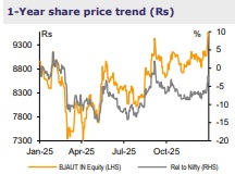 We upgrade BJAUT to BUY from Add and roll forward our TP to Dec-27E, hoisting it ~17% to Rs11,100 (from Rs9,500). This implies an upside of ~17% (+2.7% dividend yield in Dec-27E) on account of FY27E/28E EPS upgrade by ~4/9% and incorporating Bajaj Auto Credit at Rs300/sh, basis 2x FY28E P/B, given the meaningful ramp-up in operations (H1FY26 PAT at Rs2.3bn vs Rs0.6bn in FY25). We believe BJAUT offers an attractive risk-reward at current levels (1YF at 24x vs 38x/32x for TVSL/EIM), backed by strong exports trends coupled with launch of a refreshed Pulsar range in CY26 translating into a healthy 14% EPS CAGR over FY26E-28E. BJAUT’s overall domestic 2W market share has bottomed out, with slight pick-up, driven by market share of both premium motorcycles and e-scooters in Q3FY26TD. Export momentum remains strong, led by LatAm/Asia, which coupled with currency depreciation-led tailwinds should aid the overall margin trajectory given its strong exports volume mix (~44% mix as of FY26YTD vs 39% in FY25YTD). BJAUT’s e-3W portfolio has also scaled up meaningfully, and overtaken M&M to become the #1 in E-3Ws (~31.8% market share in Dec-25 vs 31.9% in FY25) while sustaining its #2 spot in E-2Ws for the last 4M, with EBITDA breakeven already achieved. Also, a gradual turnaround in KTM provides incremental upside potential.