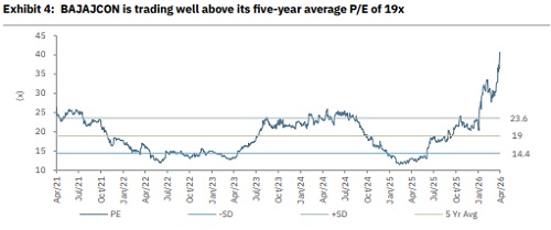 Downgrade to Accumulate, with a higher TP of INR 530: We raise our EPS estimates by 9.6%/16.5% for FY27E/28E, to factor in overall improvement in revenue and margin. We thus raise our TP to INR 530 on 25x (unchanged) from INR 400 as we roll forward to March 2028E P/E. We downgrade BAJAJCON to Accumulate from Buy due to the recent rise in stock price.