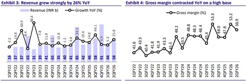 BHE reported a strong set of results with a beat across revenue, EBITDA and PAT. Revenue grew 26% YoY to INR57.6b, beating our estimate of INR52.6b by 10%. Order book stood strong at INR746b, with an inflow of ~INR54b (+116% YoY) during the quarter. Gross margin was slightly below our estimate at 50.9% in 2QFY26. Margin performance is dependent on the project mix during the quarter. However, lower-than-expected operating expenses led to 18% beat in absolute EBITDA at INR17b (+22% YoY), while margins stood at 29.4% vs. our estimate of 27.4%. Strong topline and margin performance resulted in 16%/15% beat to our PBT/PAT estimates. PAT stood at INR12.9b, up 18% YoY vs. our estimate of INR11.2b. For 1HFY26, revenue/EBITDA/PAT grew 16%/26%/21%, while margins expanded 230bp YoY to 28.8%. Operating cash outflow stood at INR8.9b in 1HFY26 vs. an outflow of INR22.9b in 1HFY25. FCF outflow stood at INR13.4b as of 1HFY26.