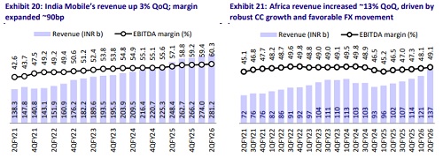 * We raise our FY26-28E EBITDA by 2-3%, driven by higher growth in AAF and slightly higher India wireless ARPU. We model a CAGR of 15%/18% in Bharti’s consolidated revenue/EBITDA over FY25-28E, driven by 1) benefits of the ~15% tariff hike in India wireless from Dec’25, 2) continued acceleration in Home broadband net adds, and 3) strong double-digit growth in Africa.