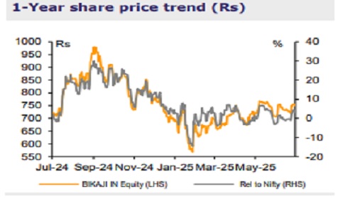 We maintain BUY, with a 9% increase in our Jun-26E TP to Rs900, on 65x P/E. In the last couple of years, the company has added revenue streams, which enhance the long-term outlook: a) its own Bikaji retail network (backend in place, will gain shape from FY27E); b) The Hazelnut Factory (40% stake) aiding the premium QSR play; c) Ariba (55% stake), aiding frozen snack exports and its own retail backend opportunity; d) addition of bakery capacity in the South, and e) a 50:50 joint venture plan with CG Group in Nepal. We see these steps taking longer to shape up; however, these would enhance Bikaji’s growth longevity. We raise our target multiple to 65x, from 60x. The management commentary around a rebound in growth from Q2 is promising; this, along with steady margins would aid earnings. We now expect a 40% EPS CAGR over FY25-28E.
