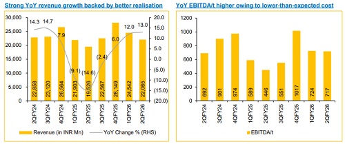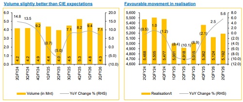 BCORP reported Q2FY26 consolidated revenue and EBITDA of INR 22,065 Mn (+13.0% YoY, -10.1% QoQ) and INR 3,049 Mn (+72.1% YoY, -12.1% QoQ) vs Choice Institutional Equities (CIE) estimates of INR 20,630 Mn and INR 2,240 Mn, respectively. Total volume for Q2 stood at 4.3 Mnt (vs CIE est. 4.1 Mnt), up 7.1% YoY and down 11.3% QoQ.