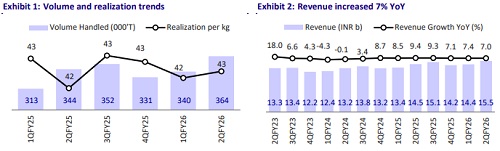 * Blue Dart Express’s (BDE) revenue grew ~7% YoY to INR15.5b in 2QFY26 (in line). The company handled 0.36m tons of cargo volumes (+6% YoY) in 2QFY26. Realization rose ~1% YoY to INR42.6/kg. It carried 106.3m shipments in 2Q.