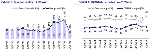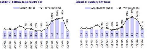 * Adj. PAT stood at INR521m (declining 11% YoY, declining 43% QoQ) in 2QFY26, below our estimate of INR709m.