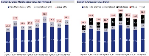 * Profitable growth remains the key focus in International segment: International segment saw a GMV growth of 8.9% YoY (+16.4% QoQ), a beat of c.2% on JMFe. Revenue stood at INR 2.4bn, +13.3% YoY (+13.7% QoQ). Management reiterated its focus on optimising topline mix to yield superior GMV-revenue conversion and margin improvement. As a result, adjusted EBITDA margin expanded 11ppts YoY (+240bps QoQ) to reach -8%. Management believes its existing moats (brand strength, customer trust, and network effects) will sustain its long-term positioning. Company is planning to replicate its omni-channel strategy of IMC to International as well with 1st COCO store being opened in KSA in Aug’25.