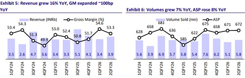 * Trade distribution: Revenue surged 20% YoY to INR2b, driven by strong retail execution, repeat billing, and premium portfolio traction. The LFS channel delivered 35% growth, fueled by new door additions.