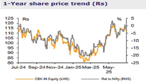 We retain BUY on the stock We largely retain our earnings estimates and expect the bank to deliver healthy RoA of 0.9-1% over FY26-28E. We retain BUY on CBK with unchanged TP to Rs130, valuing the standalone bank at 0.9x Jun-27E ABV and subs at Rs6/sh. Notably, the bank plans to list its insurance and AMC JV which would lead to better value discovery and capital efficiency. Key risks: Lower than expected growth/margins and ECL implementation.