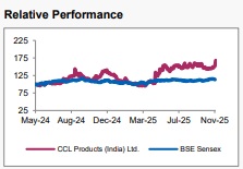 Financial Performance: CCL Products’ consolidated revenue for Q2FY26 stood at Rs 1,127 Cr, registering a 52.6% YoY growth. Gross margins declined by 524 bps to 34.5%, due to cost input pressures. EBITDA increased to Rs 197 Cr, up 43.8% YoY, while EBITDA margins declined by 107 bps YoY to 17.5%. The company's PAT stood at Rs 101 Cr, up 36.4% YoY.