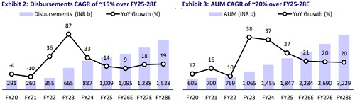* NIM expansion in FY26 is also expected to be back-ended, with stronger improvement anticipated in 2HFY26. Supported by a gradually improving funding environment and a balanced liability profile, CIFC is well-positioned to deliver margin expansion in the near-to-medium term. We model an NIM expansion of ~10-15bp each in FY26/FY27.