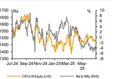 Cipla’s 1QFY26 revenue was below our estimates, primarily on account of a sharp miss in domestic sales. The EBITDA beat (vs consensus; in line with our estimate, albeit with margin ahead of estimate) was gross margin-led. We caution against meaningfully extrapolating the 1Q margin beat given that Cipla’s margin, even in a normalized domestic growth scenario, tends to be a tale of two halves. Margin trends over the last 3 years include the favorable impact of gRevlimid and do not serve as a guide; however, 2HFY26 is likely to stay true to the traditional script (2H margins lower vs 1H) owing to the expected significant decline in gRevlimid contribution 3Q onward. The management maintaining its full year EBITDA margin guidance (23.5-24.5%) reflects this dynamic. 1Q domestic weakness (~3% YoY growth in branded Rx), which was attributed to adverse seasonality and an organizational realignment, reinforces our view that near-term domestic growth is likely to undershoot street expectations (refer to our FY25 ARA note). We raise FY26E/27E EPS by 4%/2% (note that we are still building in an uptick in domestic growth from 2Q + double-digit domestic growth in FY27E). We roll forward to Jun-27E EPS and revise up our TP by ~7% to Rs1,600 (vs Rs1,500 earlier); retain REDUCE.