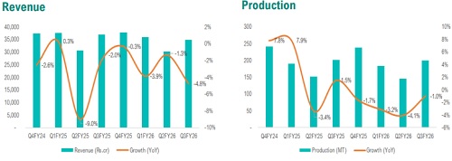 * Coal India’s consolidated revenue fell 5.2% YoY to Rs. 34,924cr in Q3FY26 owing to lower coal offtake volumes and softer e-auction realisations, partly offset by improved notified processes for FSA supplies.