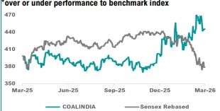 Coal India reported moderate Q3FY26 results, driven by softer operational stability, improved evacuation infrastructure, higher mechanisation and diversification into renewables and critical minerals, alongside downstream integration initiatives and stronger digital mine management practices. Continued investments in clean energy projects, mineral diversification and logistics optimisation could support medium-term sustainability while maintaining coal’s strategic relevance. Looking ahead, an intense early summer is expected to accelerate power demand and drive a sharp recovery in coal offtake, offsetting the subdued performance seen earlier in the fiscal year. Geopolitical tensions in Iran have surged global energy prices, positioning Coal India to benefit from higher e-auction realisations as industries pivot from costly imports to domestic coal. Therefore, we upgrade our rating on the stock to BUY, with a revised target price of Rs. 506, based on 6.3x FY28E EV/EBITDA.