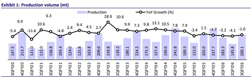 * Production for 3QFY26 stood at 200.1mt (-1 YoY and +37% QoQ), and offtake stood at 188.7mt (-3% YoY and +14% QoQ).