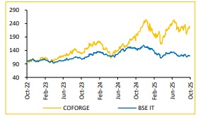COFORGE reported margin resilience in Q2FY26, with EBITM rising 251 bps QoQ to 14.0% due to lower SG&A costs. The company aims to maintain EBITM at around 14% going ahead aided by large-deal ramp-ups. Management intends to invest back any excess to 14% of EBITM, for prioritizing growth over margins. Accordingly, we expect EBIT margins to remain range-bound through FY27E–FY28E. The company targets FCF/PAT conversion at 70%-80% going forward. Employee headcount stood at 34,896 as of Q2FY26, while attrition rate remained stable at 11.4%.