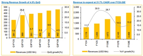 * Reported Revenue for Q2FY26 stood at USD 462.1Mn up 4.5% QoQ (vs CIE est. at USD 467.0Mn) and 5.9% in CC terms. In INR terms, revenue stood at INR 39.9Bn, up 8.1% QoQ.