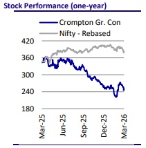 * We expect CROMPTON to report a revenue/EBITDA/PAT CAGR of 8%/14%/17% over FY26-28. We estimate its OPM to expand to ~11% by FY28 from ~10% in FY26. CROMPTON trades at 29x/24x FY27E/FY28E P/E. We reiterate our BUY rating with a TP of INR350, based on 33x FY28E EPS.