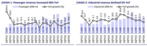 The powergen segment delivered a strong performance with revenue rising 50% YoY and 27% QoQ to INR13.4b, driven by broad-based demand across low, medium, and high horsepower gensets and the lumpy execution of data center orders. Data centers contributed around 40% of overall powergen sales in Q2FY26, supported by lumpy project execution. Excluding data centers, core powergen sales grew ~20% YoY, led by healthy demand from hospitals, real estate, and commercial buildings. Pricing has largely stabilized post the CPCB IV+ transition, though competitive intensity remains across all horsepower categories. Overall, we expect powergen demand to remain strong, while the data center contribution is likely to normalize over the next few quarters as project execution schedules even out. We expect the powergen segment revenue to clock a 17% CAGR over FY25-28.