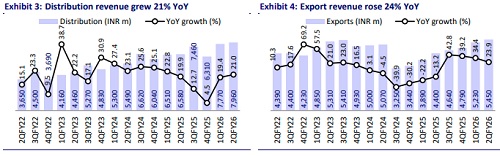 The distribution segment reported revenue of INR8.0b, up 21% YoY and 2% QoQ, reflecting strong aftermarket performance driven by healthy demand across service and parts categories. The company continues to enhance its service capabilities and readiness to support CPCB IV+ compliant engines, which are expected to expand the addressable aftermarket base over time. We expect the distribution segment to record a CAGR of 19% over FY25-28.