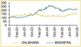 DALBHARA reported Q2FY26 consolidated revenue and EBITDA of INR 34,170 Mn (+10.7% YoY, -6.0% QoQ) and INR 6,960 Mn (+60.4% YoY, - 21.2% QoQ) vs Choice Institutional Equities (CIE) estimates of INR 33,919 Mn and INR 6,554 Mn, respectively. Total volume for Q2 stood at 6.9 Mnt (vs CIE est. 6.8 Mnt), up 3.0% YoY and down 1.4% QoQ, the drag was due to one-off events.