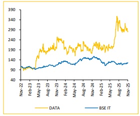 We maintain our financial estimates, supported by consistent execution discipline and expect Revenue/EBIT/PAT to expand at 11.8%/ 24.4%/ 16.4% CAGR, over FY25–28E. Thus, we maintain a ‘BUY’ rating on DATA with Target Price of INR 1130, based on FY27E and FY28E average EPS of INR 51.5, with a 22x PE multiple.