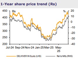 Delhivery’s Q1FY26 print was strong on the operational front, with EBITDAM continuing to expand as revenue from core segments (B2C/PTL) saw doubledigit growth (10%/17% YoY, respectively). FY26 outlook for the B2C segment appears robust, as benefits of the consolidation endure in July too, per management. While other segments (SCS, FTL, CBS) saw a muted quarter (for for various reasons), the PTL segment continues to grow from strength to strength owing to Delhivery’s reliable network. Baking in the Ecom acquisition from Q2, we increase overall revenue by 5%/7% for FY26E/27E, respectively, as we expect the B2C segment to deliver 19% revenue CAGR over FY25-28E. While integration costs would impact profitability in FY26, the management target of reaching 17-18% service EBITDAM in FY26 (B2C) should bode well for the margin trajectory ahead. We maintain BUY on the stock and revise up Jun26E TP of Rs450 (by 10% from Rs410; DCF methodology), as the company’s market leadership position should allow it to tide over industry headwinds like insourcing. Additionally, Delhivery’s foray into new products like rapid commerce and on-demand intracity trucking could create adjacent growth vectors in the future as well as further drive revenue diversification.