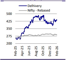 * Delhivery has emerged as one of the structurally strongest and most scalable platforms in the sector, combining rapid volume-led growth with improving profitability. The company turned APAT positive in FY25 and delivered robust performance in 3QFY26, fueled by strong volume growth and healthy margins in the core transportation segment. The acquisition of Ecom Express further enhances scale, lifts market share to an estimated 20–25%, and strengthens network density and operating leverage.