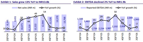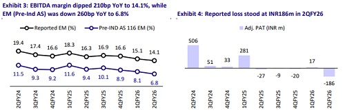 * Reported EBITDA declined 2% YoY to INR1.9b (est. INR2.0b). Loss before tax stood at INR297m vs. a loss of INR9m in 2QFY25.