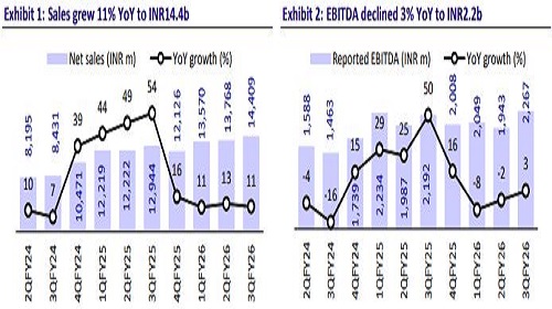 * Devyani International’s (DEVYANI) consolidated revenue grew 11% YoY in 3QFY26. India revenue was up 12% YoY, led by the Skygate acquisition and 13% YoY store expansion. KFC/PH saw same-store sales decline in 3Q, but the company reported SSSG in Jan’26 across brands, except PH.
