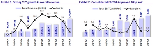 During 2QFY26, Dixon’s revenue and PAT were in line, while EBITDA beat our estimates. The reported PAT was boosted by fair-value gains on Dixon’s stake in Aditya Infotech. Consolidated revenue grew 29% YoY to INR148.6b. Absolute EBITDA grew 32% YoY to INR5.6b, beating our estimate by 7%, while margins expanded 10bp YoY to 3.8% vs. our estimate of 3.6%. The company’s adj. PAT, after excluding the fair value gains on Dixon’s stake in Aditya Infotech and gains on the transfer of the lighting business undertaking, stood at INR2.5b (+16% YoY), broadly in line. Among the segments, the mobile & EMS segment registered 41% YoY growth, while the consumer electronics and home appliances segments remained weak due to deferred demand on GST rate cuts.