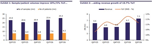 The management plans to continue investing in IT and digital integration, and provide innovation-led offerings to differentiate among organized players, including becoming India's first lab to deploy deep learning AI for cancer micro-metastasis detection. Sustained network investments (15-20 new labs and 600-800 collection centers) in FY26, along with investments in specialized genomics testing, are aimed at fortifying its footprint despite rising competition from hospital-backed and organized players. Volume growth is expected to be stable, as the management expects the Swasthfit program to maintain momentum. As highlighted in our recent ARA note, digital initiatives and infrastructure upgrades leading to cost and operational efficiencies allow DLPL to deliver industry-leading margins. With Q2 results in line with our estimates, we have largely retained our estimates (Exhibit 9). A strong balance sheet (net cash of Rs13bn), stable return ratios (FY28E RoE/RoCE at 24%/26%, respectively), and robust cash generation (OCF as a % of EBITDA at 78% in H1FY26) lend comfort on valuations. Key risks: Increased competition in the organized market, and predatory pricing from any market participant.