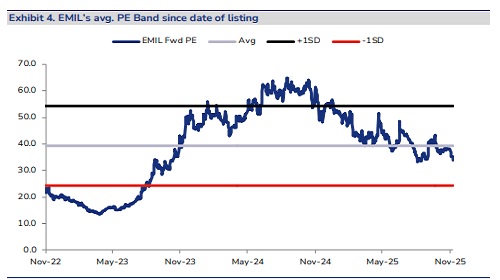 EMIL’s 2QFY26 performance was inline on sales but miss on profitability due to weaker margins. Same store sales growth (SSSG) of 11.4% was healthy, YoY margins were impacted by higher discounts (in first 20 days of September), higher store additions leading to increase in costs and an uptick in A&P spends due to early festive. In the near term, management is looking at strong 2H, led by healthy festive demand and benefit of GST rationalisation, which, along with better mix should aid margin improvement. Over the medium term, with share of mature stores (operating for >4 years) increasing, throughput/store and profitability of the business should also see gradual improvement. Factoring 2Q margin miss, we have cut our EPS estimates for FY26/27/28E by 23%/10%/8%. We reckon that the opportunity in organised electronic retail industry is large & EMIL has necessary ingredients to tap the same. Valuations at 29x/22x FY27/28E are not demanding and outlook is improving; hence, we maintain BUY with revised TP of INR 156 (27x Dec’27E, earlier INR 165). Sustaining SSSG/pace of recovery in margins will be key for rerating.