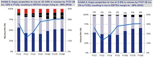 Margin to further strengthen with rise in contribution from high-margin argon: We expect EIGL’s argon production to grow at 83% CAGR from ~9TPD in FY25 to +50TPD by FY28 once all the announced expanded capacity is commissioned. Hence, EIGL is strategically positioned for further expansion in EBITDA margin to 38% in FY28 (from 35% in FY25% and 24% in FY24) given argon’s EBITDA margin is significantly higher at 70- 80% vs. 30-35% in case of oxygen and nitrogen — Exhibit 3-4.