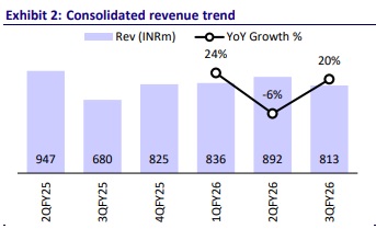 * ELLEN reported a total revenue of INR813m (in line) in 3QFY26, up ~20% YoY. EBITDA margin stood at 30.6% (est. 35.3%) vs. 39.7% in 3QFY25. EBITDA declined 8% YoY to INR249m (est. INR293m). Adj. PAT grew 36% YoY to INR261m (est. INR248m), led by higher other income (up 71% YoY).