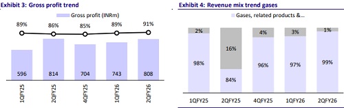 * Gases, related products & services revenue grew 10% YoY to INR879m, EBIT declined 8% YoY to INR362m, and EBIT margin was 41% (vs. 49% in 2QFY25).