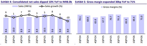 * Trade disruption and extended monsoon hurt revenue growth: Consol. net sales declined 10% YoY to INR7,985m (est. INR8,018m). Domestic business revenue declined 15% YoY, along with a volume decline of 16% (est. -13% and -3% in 1QFY26). Domestic business (excluding talc and heat powders) declined by 12%. Talc/Heat powders’ revenue dipped 76% YoY and faced a second challenging quarter as excessive rains impacted offtakes in the category on a high comparative base. GST 2.0 implementation caused temporary trade disruptions in Sep’25; however, from Oct’25 onwards, trade sentiments and deferred winter loading are recovering. Excluding GST-impacted categories, the non-impacted portfolio delivered 10% growth in 2QFY26. International business revenue grew 8% YoY.