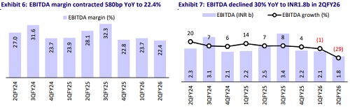 * EBITDA margin contracts sharply: Gross margin expanded marginally by 30bp YoY to 71% (est. 70%), aided by input price stability. Employee expenses and ad spending rose 7% each, while other expenses declined 8% YoY. However, EBITDA margin contracted 580bp YoY to 22.4% (est. 21.4%).