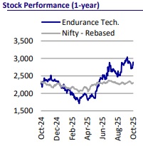 Endurance (ENDU) has consistently outperformed core industry growth, both in India and Europe, over the last five years. Given its healthy order backlog of INR36.1b worth of new orders, we expect ENDU to sustain its outperformance over FY25-27. Management aims to ramp up its 4W mix to 45% of consolidated revenue from 25% currently. To achieve this target, ENDU is setting up a new plant in AURIC (Maharashtra) to fulfil new orders and has tied up with a Korean partner to foray into 4W suspensions. It has also received its first orders for drum brakes and drive shafts. MoRTH’s proposal to mandate ABS on all 4Ws can increase ENDU’s addressable market by 10x, and ENDU targets a 25% share of this higher base going forward. This proposal, if finalized, can alone boost ENDU’s revenue. Its Europe performance has demonstrated commendable resilience, and we expect it to sustain this healthy performance on the back of new orders and the recent integration of Stoferle. Considering these growth drivers, we estimate ENDU to deliver a CAGR of ~18%/21%/20% in consolidated revenue/EBITDA/PAT over FY25-27. We reiterate our BUY rating with a TP of INR3,311 (based on 36x Sep’27E consolidated EPS).