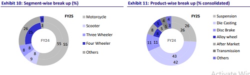 Management plans to increase its 4W mix to 45% from the current 25% of consolidated revenue. Critical progress made in this segment include: 1) new order wins in die-castings, 2) first drum brake order; work ongoing on advanced braking solutions; 3) first drive shaft order and JLR Al forgings order SOP in Jan’26. Apart from this, ENDU has tied up with a Korean partner to foray into 4W suspensions. Its Stoferle acquisition in Europe would also help to boost 4W mix along with synergy benefits.