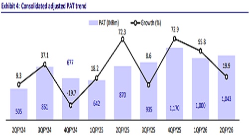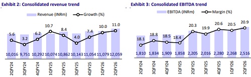 * For 1HFY26, revenue/EBITDA/adj PAT grew 11%/18%/35% YoY to INR23b/INR4.8b/INR2b.