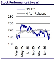 * EPL is trading at ~10.3x FY28E EPS of INR19.9 and ~5x FY28E EV/EBITDA. We value the stock at 14x FY28E EPS to arrive at a TP of INR270. We reiterate our BUY rating on the stock.
